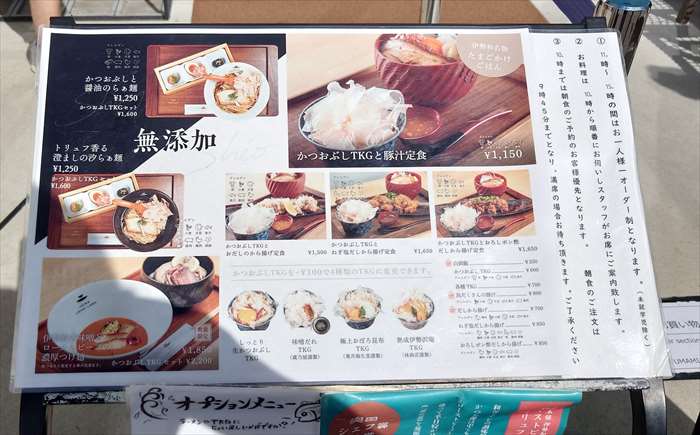 私は「かつおぶしと醤油らぁ麺とTKGセット ¥1600」息子は「かつおぶしと醤油のらぁ麺¥1250」友人は「ローストビーフとトリュフオイルの冷たいらぁ麺¥1550」